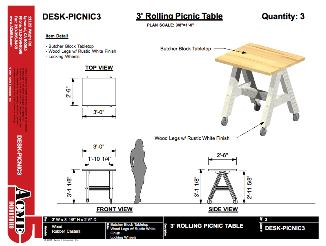 3′ Rolling Picnic Table